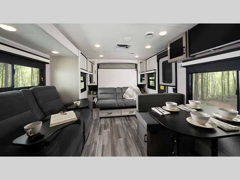 Sleeps 5 Slides 2 Length 35 ft 10 in Ext Width 8 ft Ext Height 10 ft 10 in Int Height 6 ft 6 in Interior Color Dune Gray Hitch Weight 985 lbs GVWR 8995 lbs Dry Weight 7265 lbs Cargo Capacity 1730 lbs Fresh Water Capacity 55 gals Grey Water Capacity 61 gals Black Water Capacity 30.5 gals Tire Size ST225/75R15E Furnace BTU 35000 btu Available Beds Queen Refrigerator Type 12V Refrigerator Size 11 cu ft Cooktop Burners 3 Number of Awnings 1 LP Tank Capacity 20 lbs. Water Heater Type On demand Tankless AC BTU 13500 btu TV Info LED Smart TV Awning Info 20' Max-Length Power w/LED Light Axle Count 2 Number of LP Tanks 2 Shower Type Standard Electrical Service 50 amp Solar Wattage 200 watts Similar Floorplans