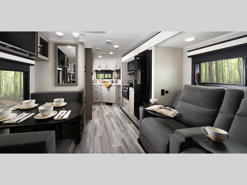 Sleeps 5 Slides 1 Length 30 ft 1 in Ext Width 8 ft Ext Height 10 ft 8 in Int Height 6 ft 6 in Interior Color Dune Gray Hitch Weight 715 lbs GVWR 7500 lbs Dry Weight 5900 lbs Cargo Capacity 1600 lbs Fresh Water Capacity 55 gals Grey Water Capacity 61 gals Black Water Capacity 38 gals Tire Size ST205/75R14D Furnace BTU 35000 btu Available Beds Queen Refrigerator Type 12V Refrigerator Size 11 cu ft Cooktop Burners 3 Number of Awnings 1 LP Tank Capacity 20 lbs. Water Heater Type On Demand Tankless AC BTU 13500 btu TV Info LED Smart TV Awning Info 19' Max-Length Power w/LED Light Axle Count 2 Number of LP Tanks 2 Shower Type Standard Electrical Service 30 amp Solar Wattage 200 watts Similar Floorplans