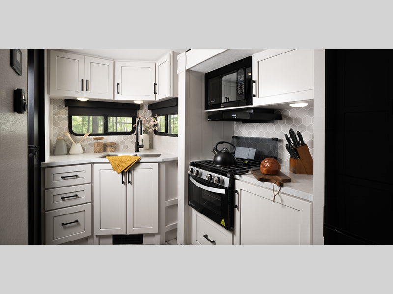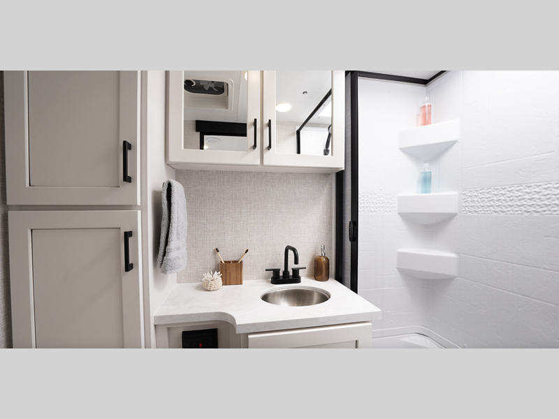 You will love the seamless countertops throughout, along with the stylish interior and the new InVision appliance package. A 13,500 BTU roof.mounted Quiet Series A/C will keep you comfortable, while the MaxxAir vent fan in bathroom and living room allows for even more comfort, and the on-demand water heater means everyone can freshen up before bed. Each model is constructed with a Magnum Truss roof system and Stronghold VBL walls with double-sided Azdel composite, so you can plan to enjoy your Jay Feather for years to come.
